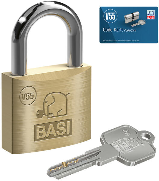 robosztus sárgaréz lakattestedzett acél kengyelkétoldali reteszelésbiztonsági cilinderzár6 csapos zárrendszermegerősített és hosszított kulcsnyakkulcsmásoláshoz kódkártyaBASI V55-ös zárbetétekhez illeszthető5 darab gyári fúrt kulccsal áruljuk